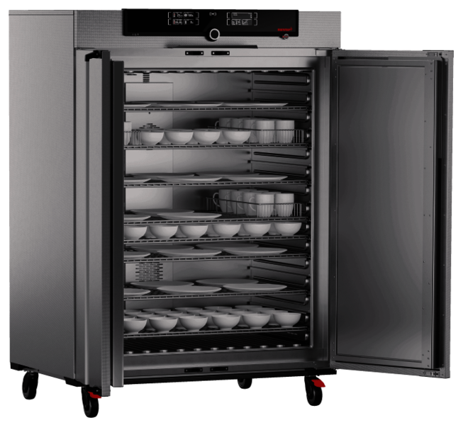 This is a special, customized device made by Memmert. This device uses air circulation process to help with dishwasher usability tests. This tailor made device has several advantages. For example, it prevents temperature overshoots as its temperature control and heating power have been adapted to the test parameters stipulated in EN50242/EN60436.