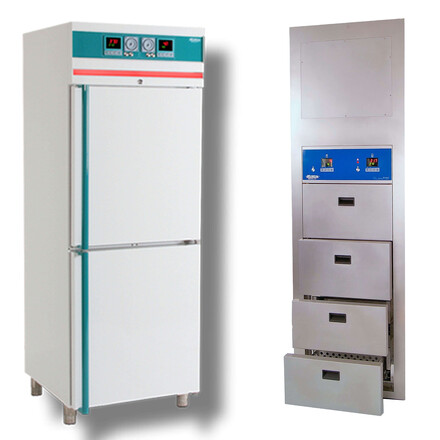 The hypothermia cabinets are also available als built-in units. These are always tailor-made according to the customer's wishes. The exterior consists of coated stainless steel or brushed stainless steel. For the interior you can choose from 316 stainless steel or 304 stainless steel (standard). In addition, you can choose drawers or doors and a compartment with cooling and/or heating. The built-in models are fully integrated into the wall and have a low noise level. Temperature accuracy is ± 0.5 °C at 37 °C or ± 2 °C at 4 °C.