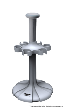 This rotatable 6-place carousel stand for pipettes is designed to hold multiple pipettes securely and conveniently. This type of stand typically allows for easy access and organization, making it ideal for laboratory settings where pipetting is frequent.