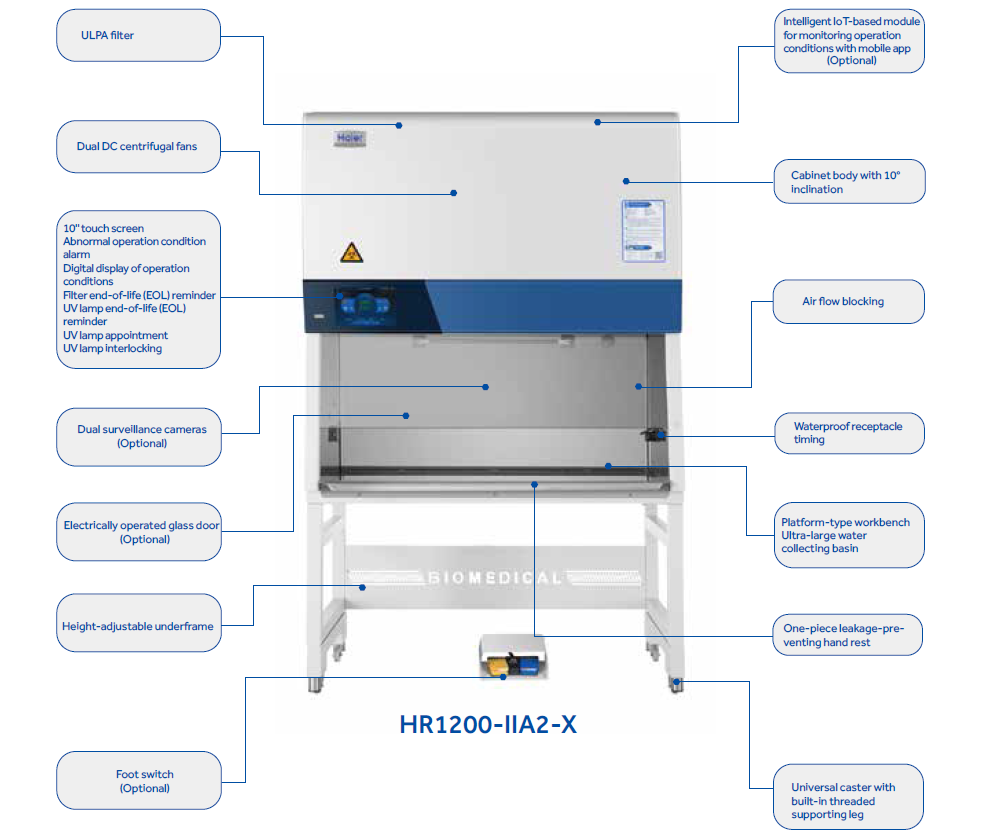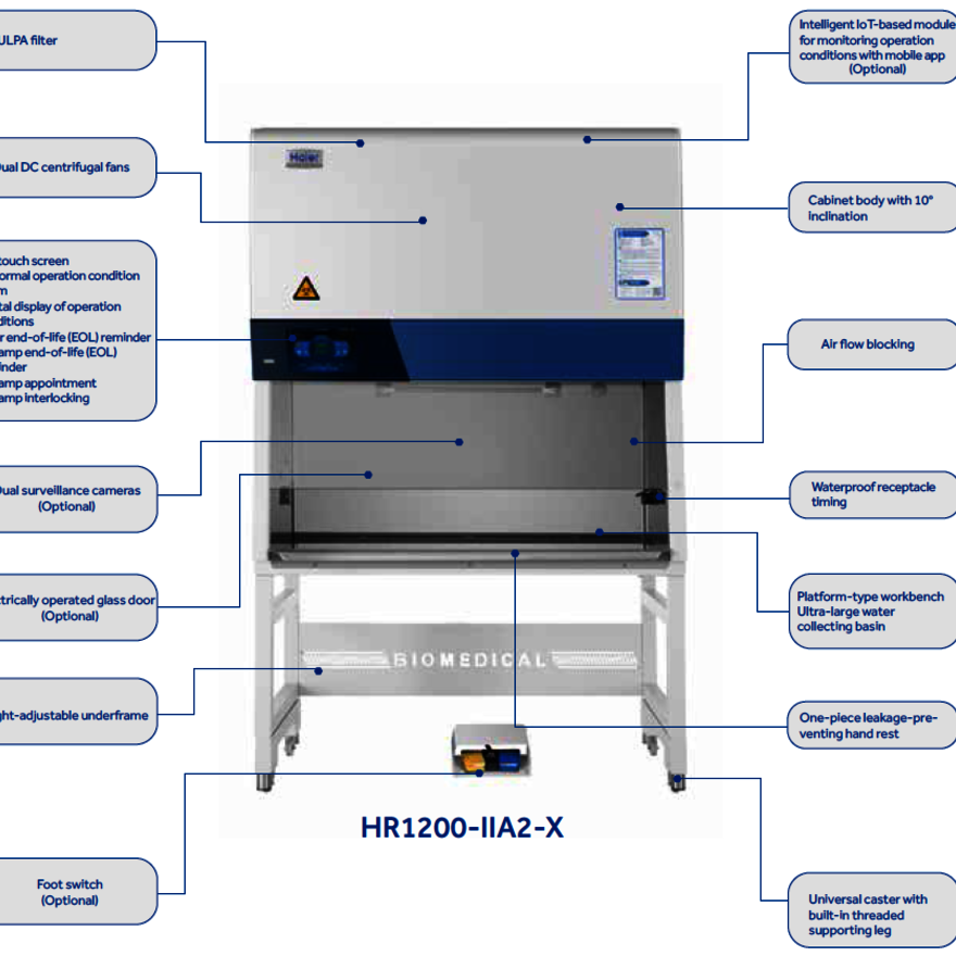 Deze Haier Biomedical biologische veiligheidskasten (X-serie) zijn de meest essentiële beschermings- en isolatieapparatuur voor bioveiligheid. Maakt gebruik van een smart ontwerp met constante luchtsnelheid om de neerwaartse luchtstroom en de inlaatluchtstroom in real-time te monitoren en aan te passen.