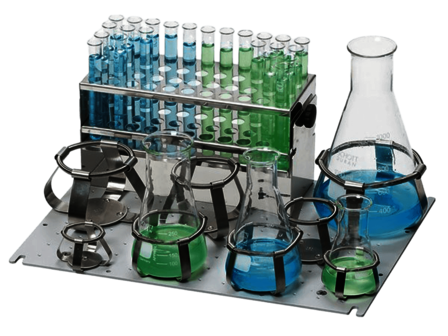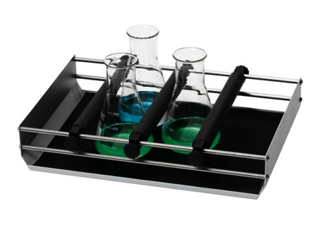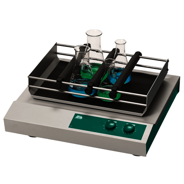 Rekken met 3 klemstrips en rubberen mat. Schudplatform 400 x 275 mm. Voor het bevestigen van rechtopstaand glaswerk. Met extra strips ook geschikt voor andere modellen.